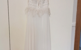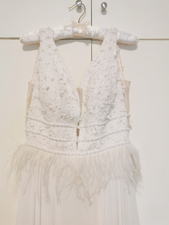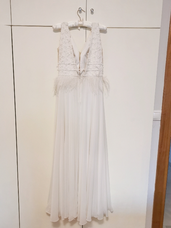 Το νυφικό είναι σε αριστη κατάσταση, δεν εχει καποιο ελάττωμα. Το μπουστο ειναι κεντημενο με ανθακια κ πέρλες, εχει πουπουλα στην περιοχη της μεσης κ δεν φεγγιζει στο κατω μερος.Πληροφορίες